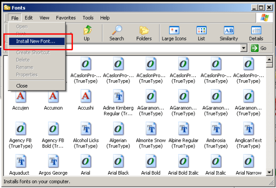 - फॉन्ट विंडो में फाइल मेनू में स्थित install new font ऑप्शन को Select कीजिए |