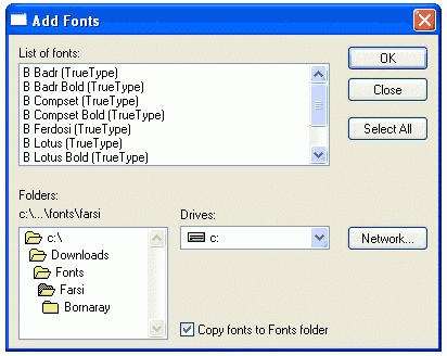 - इससे add fonts डायलॉग बॉक्स खुल जाएगा| इस डायलॉग बॉक्स में ड्राइवर लिस्ट को ओपन कीजिए और उस में से उस ड्राइव को चुनिए जिसमें नए फॉन्ट स्टोर किए गए हैं|